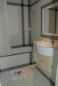 Salle de bain avec une baignoire, une douche, un lavabo intégré au meuble de rangement, toilettes.