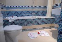 Salle de bain avec une baignoire, une douche, un lavabo intégré au meuble de rangementn et une toilettes.