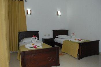 Deuxième chambre avec deux lits jumeaux, une tables de nuit et une garde robe .