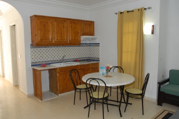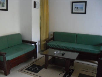 Salle de séjour avec deux canapés, un fauteuil, une table basse,télévision avec chaînes par satellite et une table ronde et six chaises.