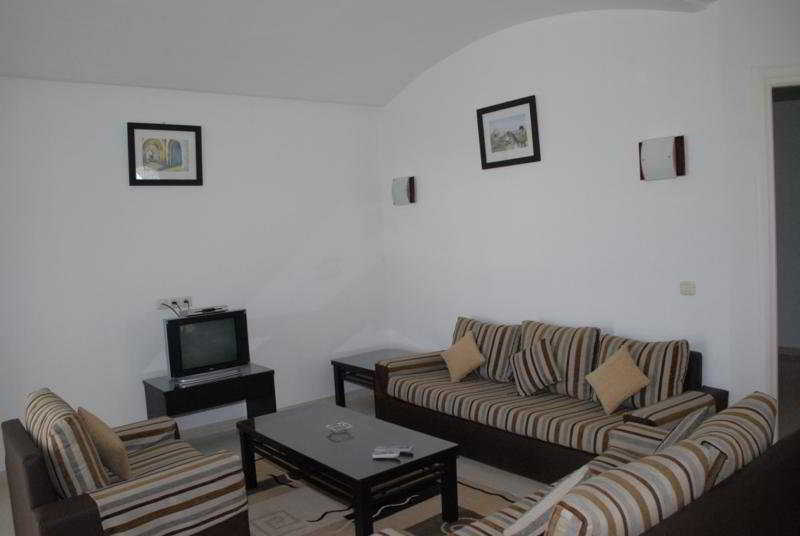 Salle de séjour avec deux canapés, un fauteuil, une table basse,ecran LCD avec chaînes par satellite et une table rectangulaire et six fauteuils.