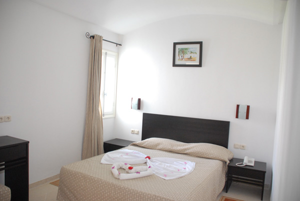 Chambre avec un lit double, une garde-robe, deux tables de nuit, une commode, un téléphone et un coffre-fort.