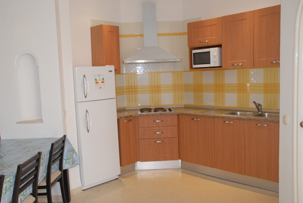 Cuisine équipée avec vaisselle et ustensiles, réfrigérateur avec compartiment de congélation, plaques de cuisson et four micro onde.
